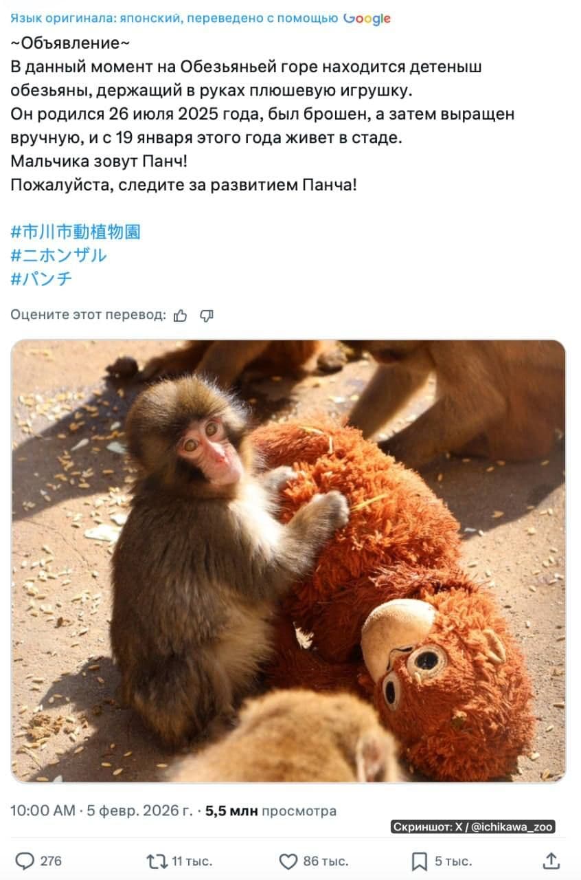 Один из самых трогательных вирусных мемов начала 2026 года посвящён детёнышу японской макаки по имени Панч, который повсюду носит с собой мягкую игрушку-орангутана. История Панча началась 26 июля 2025 года в зоопарке Ichikawa City Zoo: родная мать отказалась от малыша, и сотрудники выкормили его вручную. Чтобы детёныш чувствовал себя спокойнее, ему дали плюшевую игрушку из IKEA, к которой он быстро привязался.