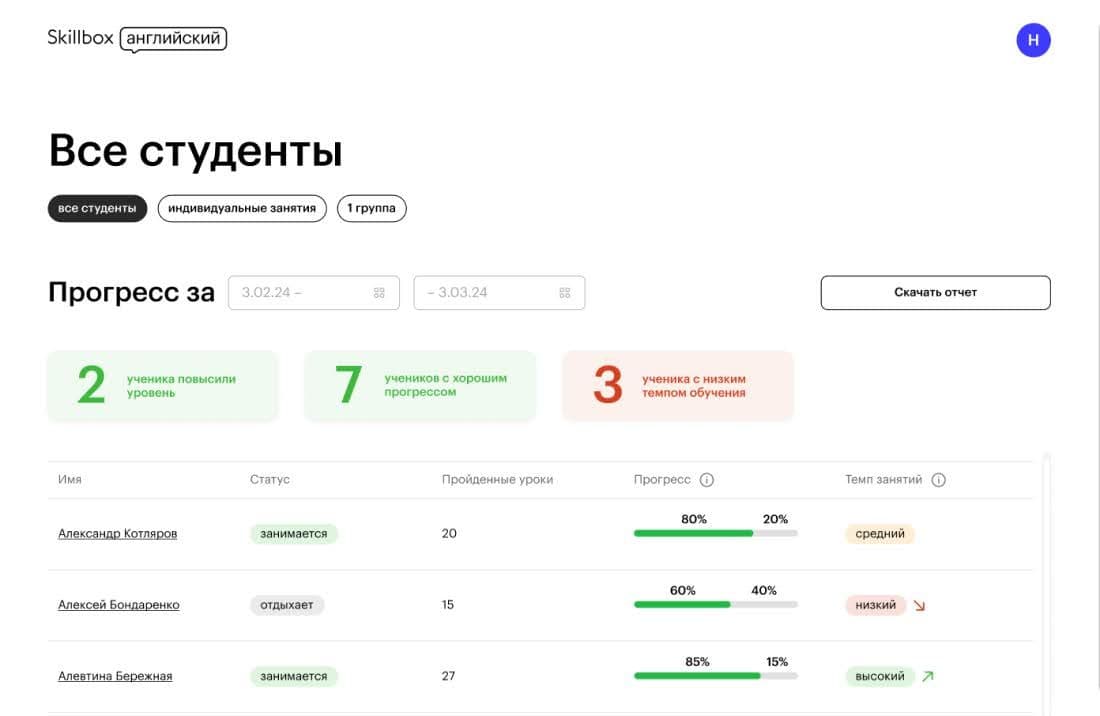 — Всё-таки чаще это работодатель, потому что сотрудники бывают разные. У нас есть студенты, которые занимаются стабильно и с интересом, кто-то регулярно делает домашку, кто-то периодически, а некоторые студенты в целом посещают занятия очень редко. На нашей платформе есть много опций, по которым можно отслеживать ход обучения студентов: посещаемость, выполнение домашнего задания и так далее.
