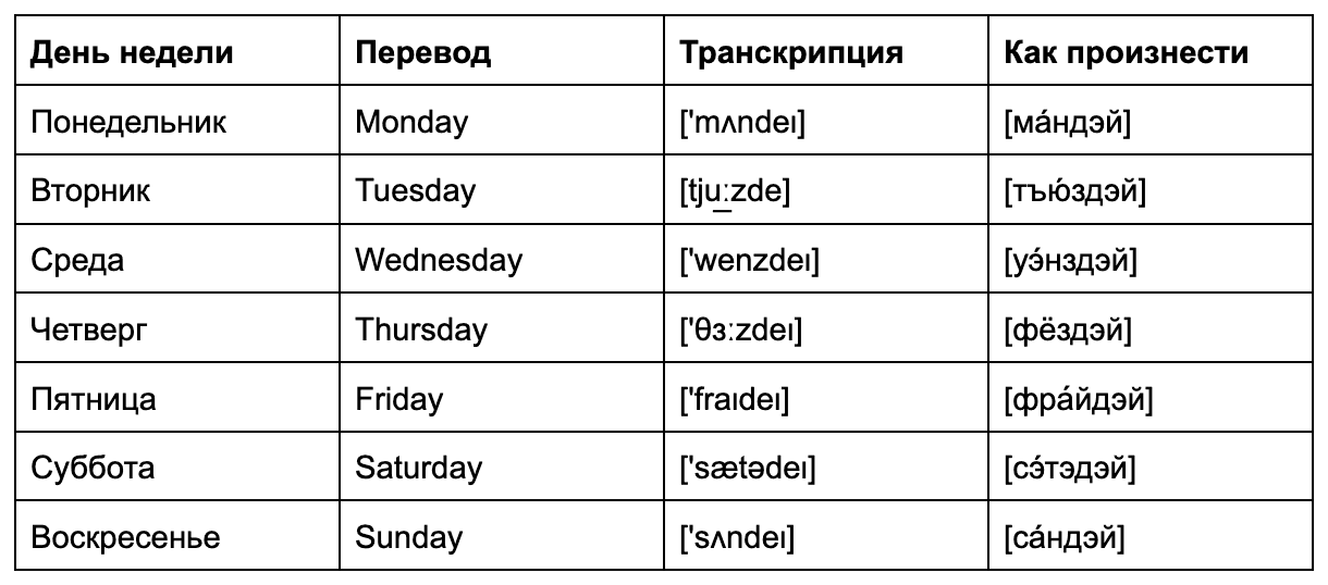 Чтобы вам было проще выучить дни недели наизусть, мы сделали для вас понятную и удобную табличку со всеми основами: названием, переводом и транскрипцией.