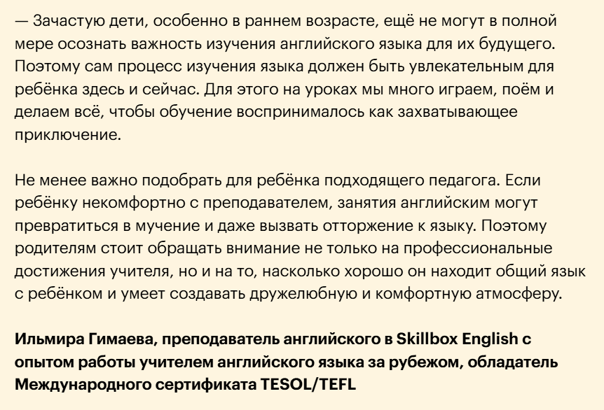 С другой стороны, чем младше ребёнок, тем проще ему слышать разные звуки и подражать им. Правда, для такого обучения контакта с носителем — или учителем — нужно очень много: не менее полутора часов в неделю, согласно исследованию 2016 года. В Skillbox English есть программы обучения английскому, рассчитанные на детей от 5 лет. Они составлены с учётом возрастных особенностей маленьких учеников и включают много интерактивных игровых элементов, чтобы теория легче запоминалась, а занятия были нескучными и увлекательными.