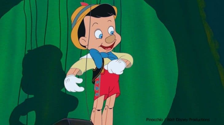 Магический мультфильм «Диснея» 1940 года о кукле, которая мечтает стать настоящим мальчиком. Сюжет знаком, пожалуй, всем: плотник Джеппетто создаёт деревянную марионетку по имени Пиноккио, загадывает желание, чтобы она стала настоящим человеком — и его исполняет фея. Однако мальчик тут же оказывается в беде.