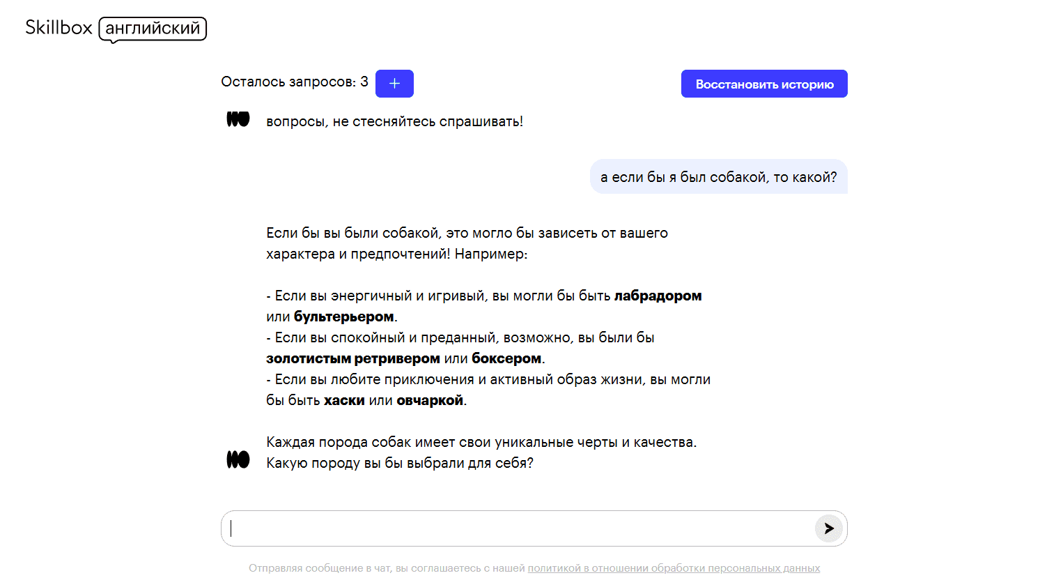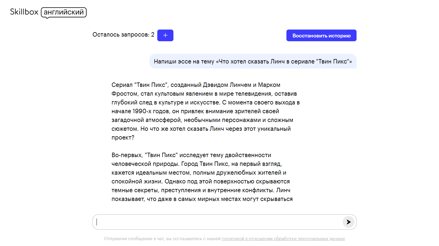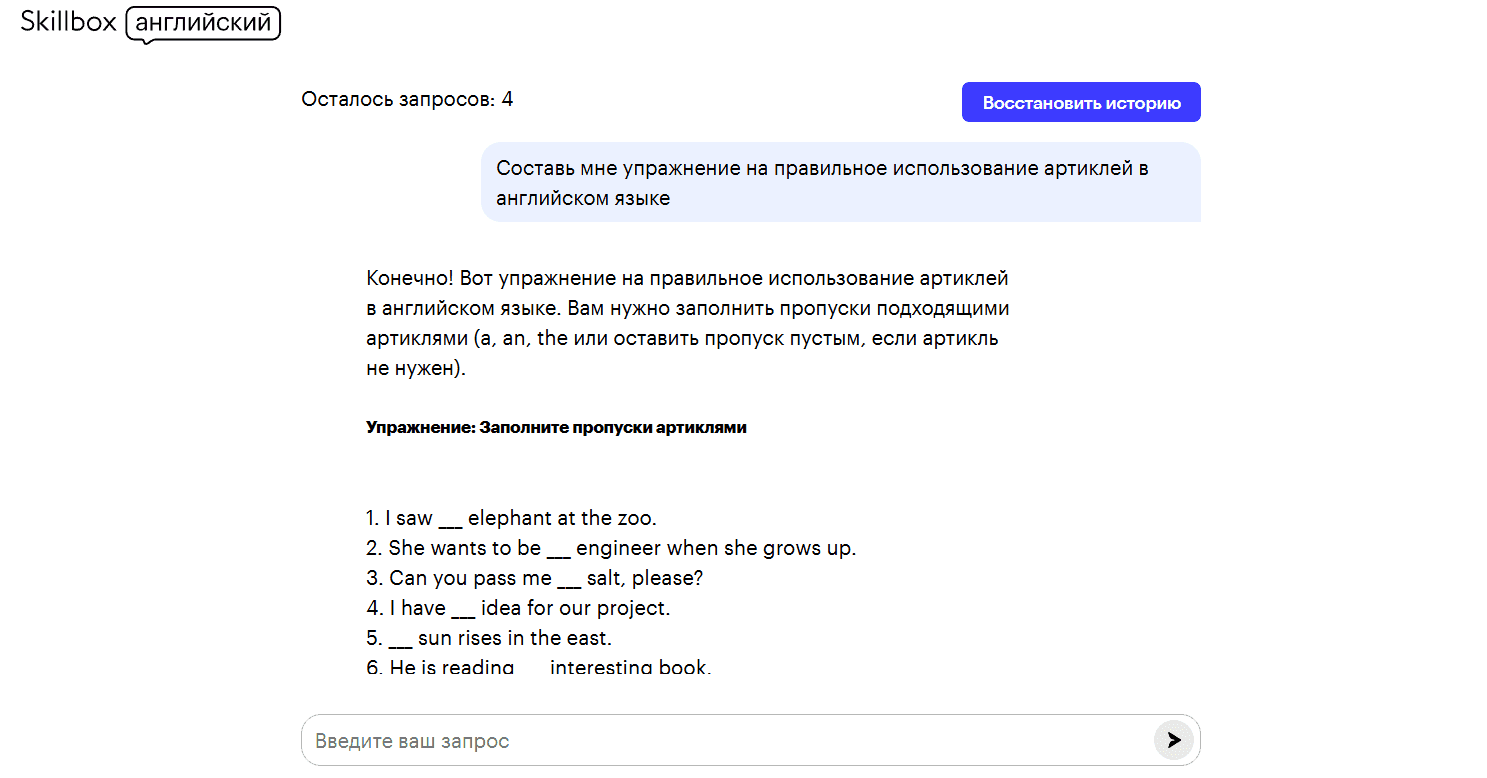 Как начать? Всё очень просто: откройте ИИ-чат на платформе Skillbox English, введите свой вопрос или сообщение — и получите ответ в течение нескольких секунд. Запрос может быть любой: от упражнения на заданную тему, чтобы вы могли практиковаться в английском, до философских размышлений.
