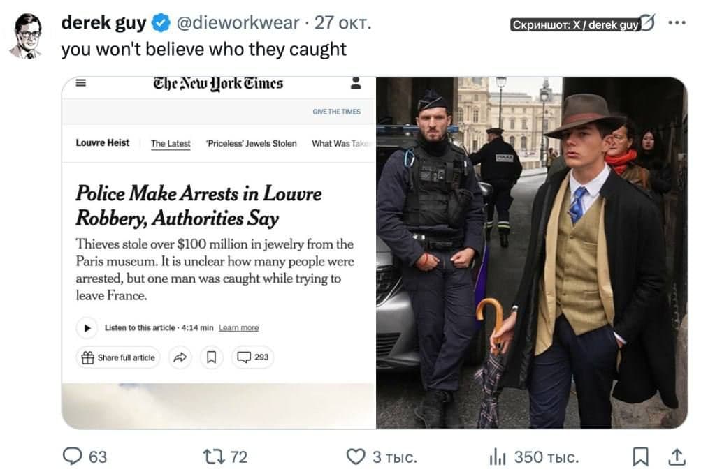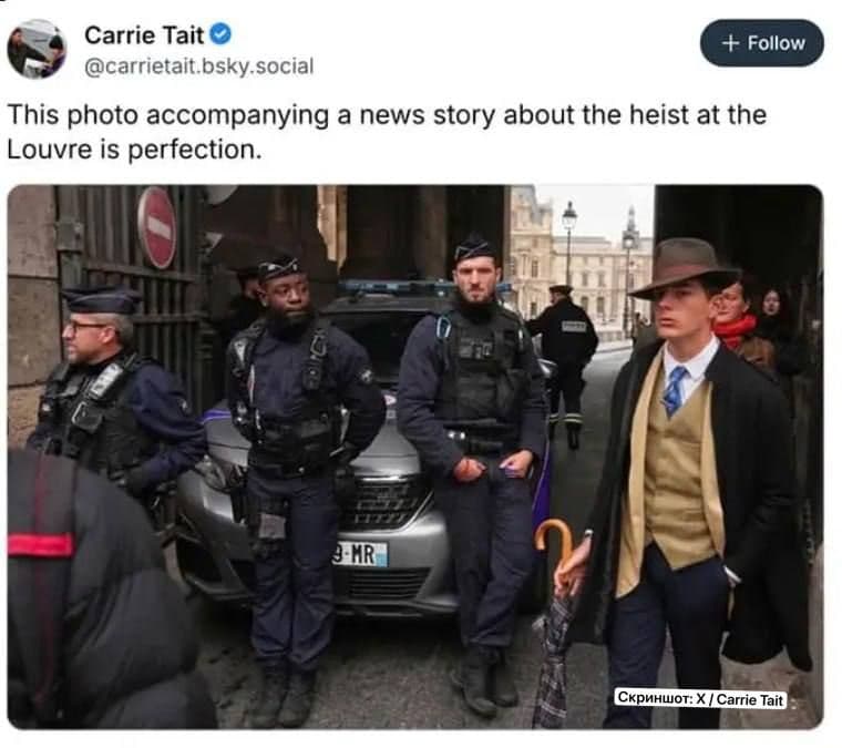 В других постах пользователи обсуждают сюрреалистичные кадры с места ограбления: полицейских и мужчину в костюме из другой эпохи, например.