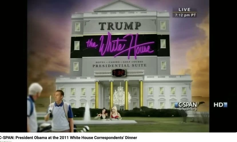 Мем выше стилизован под телетрансляцию с надписью «The White House: Presidential Suite» в неоновых огнях. Интернет мгновенно подхватил идею, превращая Белый дом в отель Trump Resort.