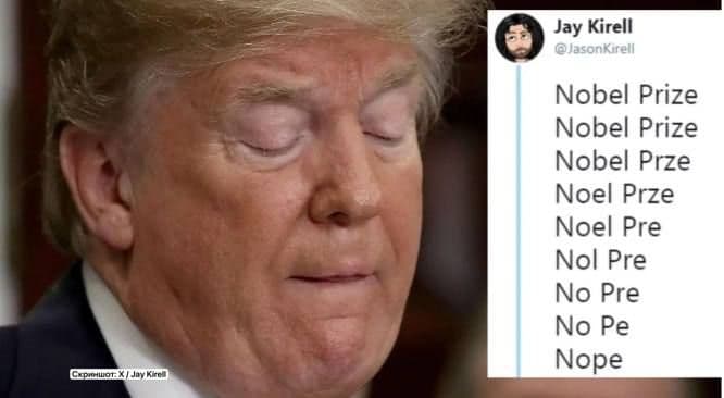 Пользователь на скриншоте выше шутит о попытках Трампа получить награду, изображая, как каждое сокращение словосочетания «Nobel Prize» превращается в «Nope» — «Нет».