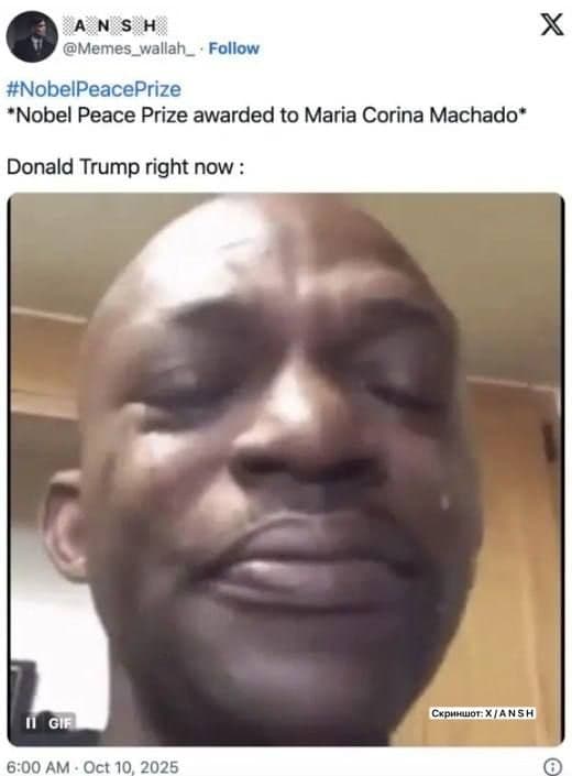 Вместо Трампа Нобелевскую премию мира венесуэльская оппозиционерка Мария Корина Мачадо — о ней и следующий мем. На нём — мужчина, пытающийся сдержать слёзы. Подпись: «Donald Trump right now» — «Дональд Трамп прямо сейчас».