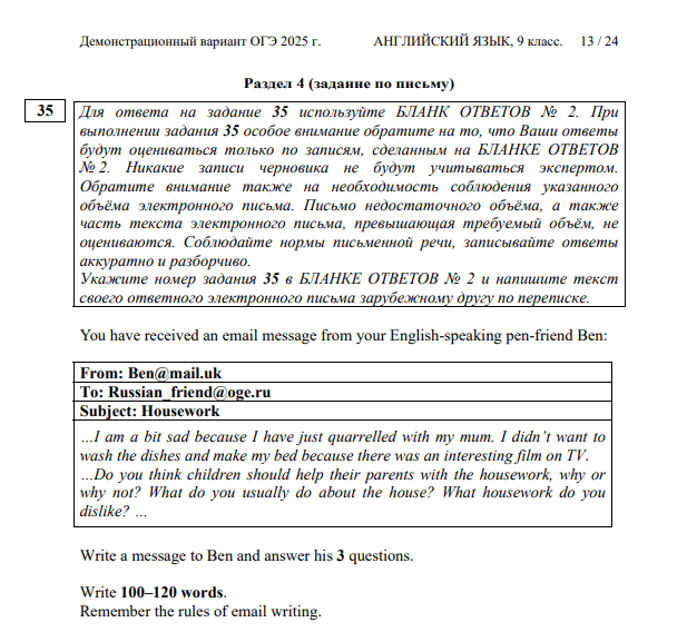 В письменной части экзамена всего одно задание: нужно составить электронное письмо объёмом 100–120 слов. Здесь проверяется, насколько школьник владеет письмом на английском языке: оцениваются логика, структура, соблюдение темы. Важно заранее изучить критерии оценивания на сайте ФИПИ, прорешать несколько тренировочных работ и научиться избегать распространённых ошибок в лексике и пунктуации.