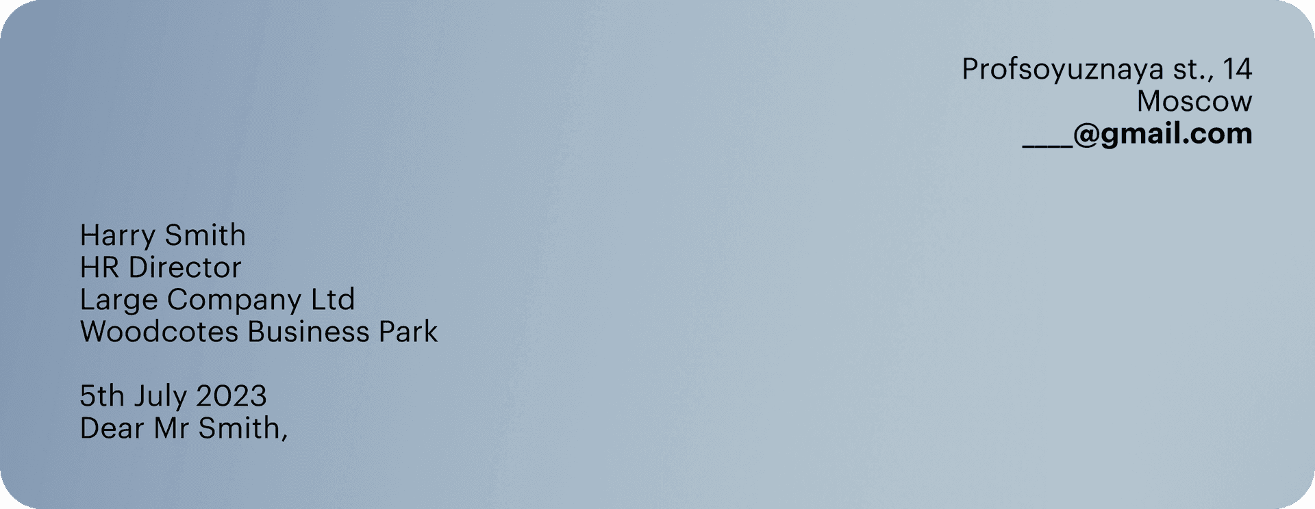 Затем укажите должность, имя работодателя (хотя, скорее всего, это будет эйчар) и адрес компании — по крайней мере, если предполагается, что вы отправите ответ почтой.