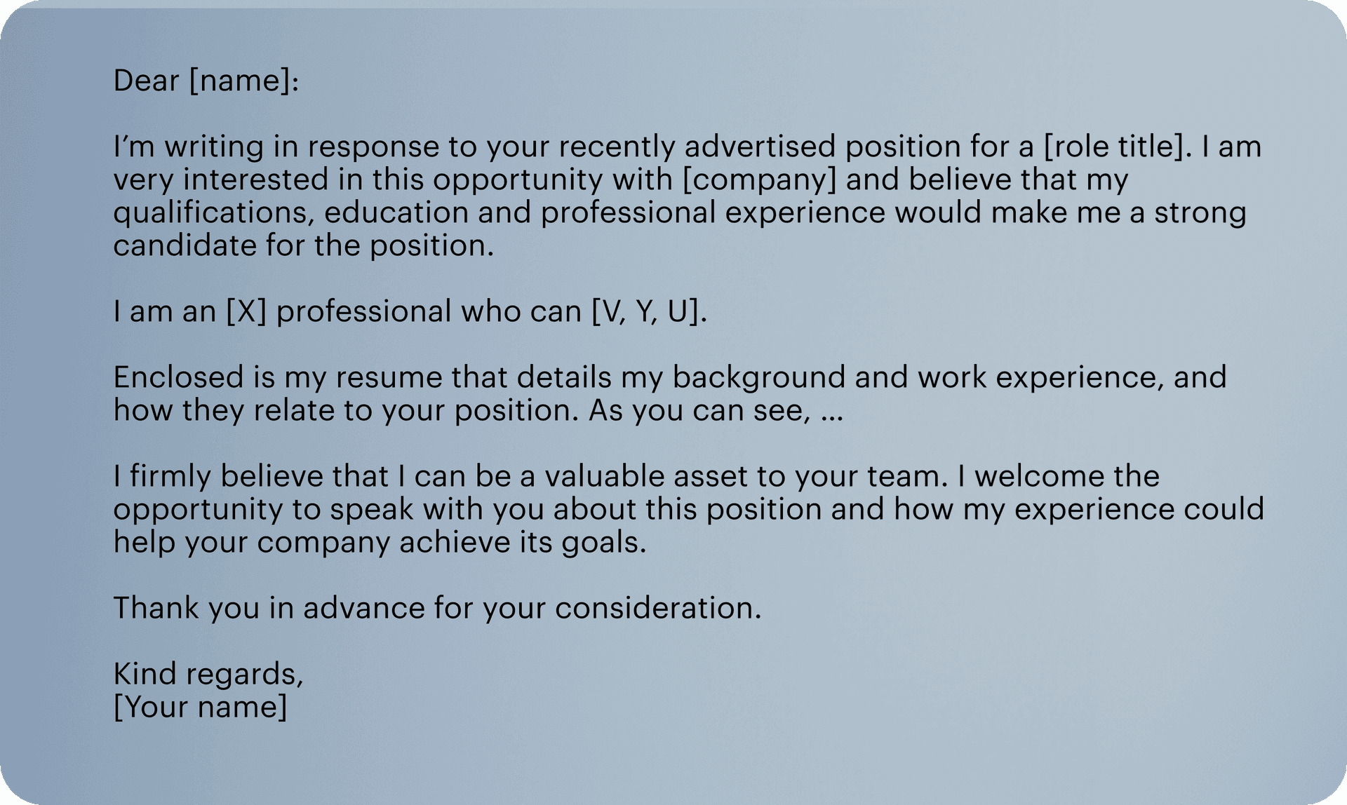 Я пишу в ответ на вашу недавно объявленную вакансию на [название роли]. Я очень заинтересован в этой возможности работать в [название компании] и считаю, что моя квалификация, образование и профессиональный опыт делают меня сильным кандидатом для этой должности.