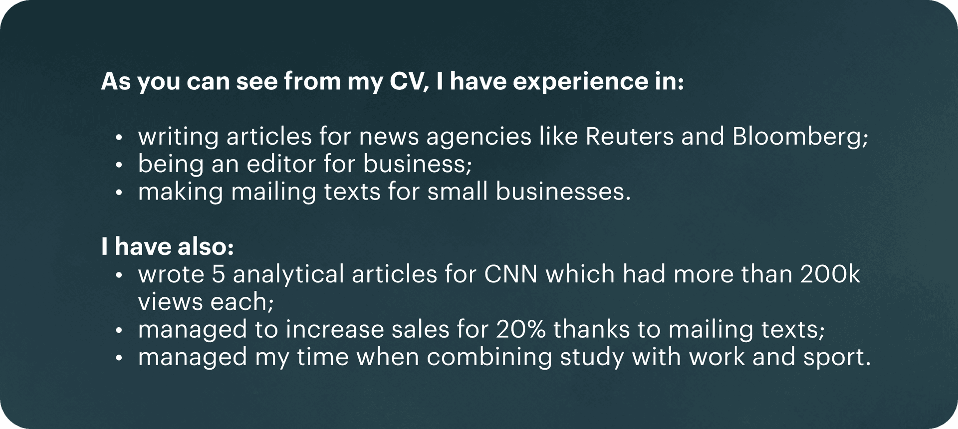«Как видно из моего резюме, у меня есть опыт работы в: написании статей для информационных агентств, таких как Reuters и Bloomberg; работе редактором для бизнеса; составлении почтовых текстов для малого бизнеса.