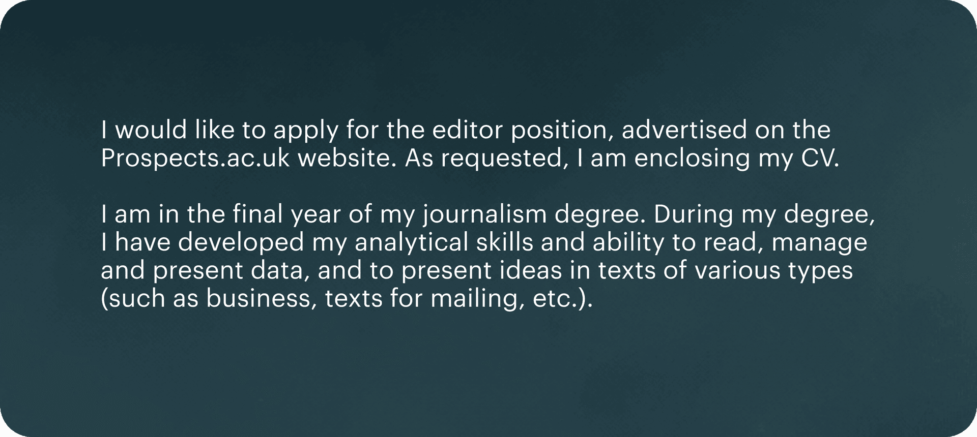 «Я хотел бы подать заявку на должность редактора, объявление о которой размещено на веб-сайте Prospects.ac.uk. По вашей просьбе прилагаю своё резюме.
