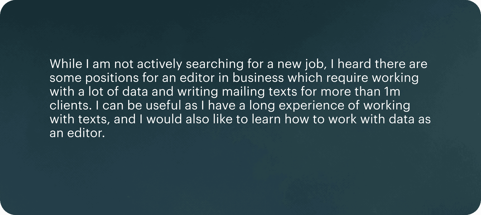 «Хотя я не ищу новую работу активно, я слышал, что в бизнесе есть должности редактора, которые требуют работы с большим количеством данных и написания текстов для рассылки для более чем 1 миллиона клиентов. Могу быть полезен, так как имею большой опыт работы с текстами, а также хотелось бы научиться работать с данными в качестве редактора».