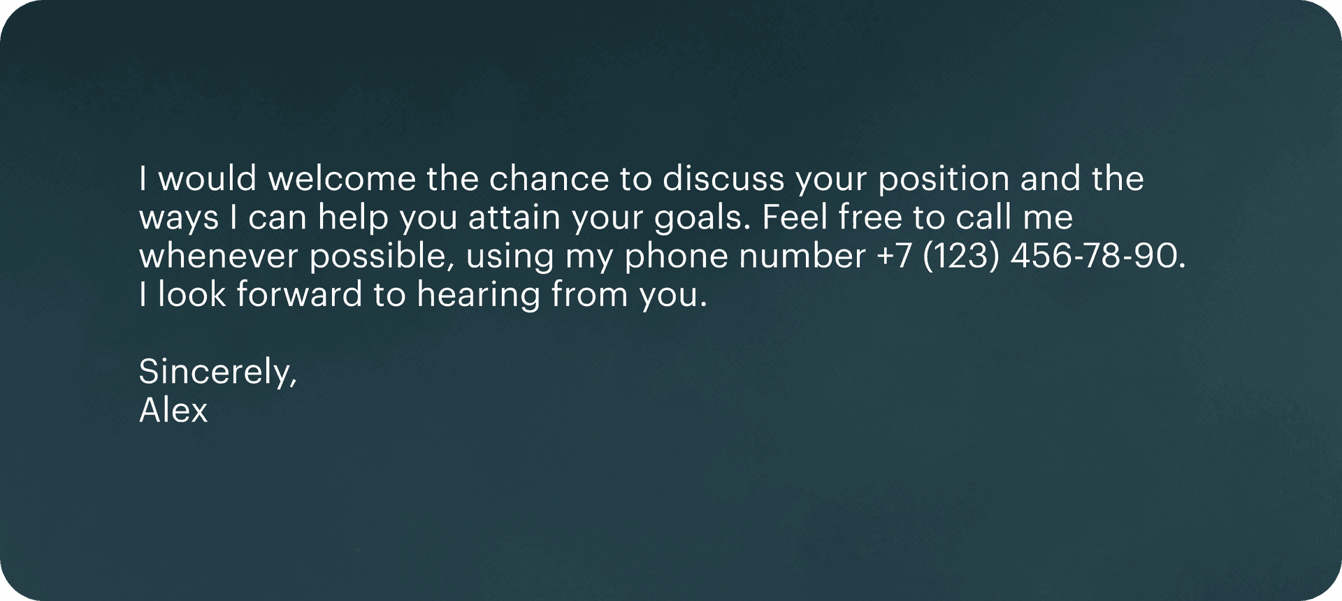 «Я был бы рад возможности обсудить вашу позицию и то, как я могу помочь вам в достижении ваших целей. По возможности звоните мне по номеру телефона +7 (123) 456-78-90. C нетерпением жду вашего ответа. Искренне, Алекс»