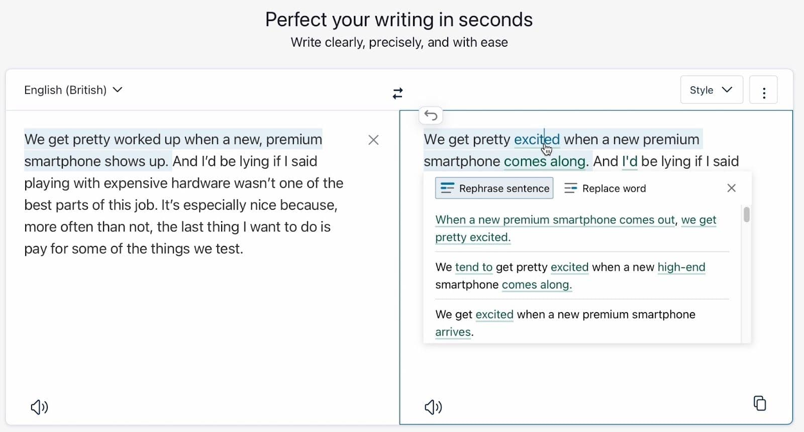 Ещё один переводчик, который выдаёт сопоставимый с конкурентами результат. Среди интересных функций — Rephrase, которая предлагает альтернативные варианты перевода. Однако, в отличие от DeepL, Rephrase работает на весь текст целиком и не позволяет выбрать отдельные слова и фразы. Да и использовать эту функцию без платной подписки можно всего 18 раз.