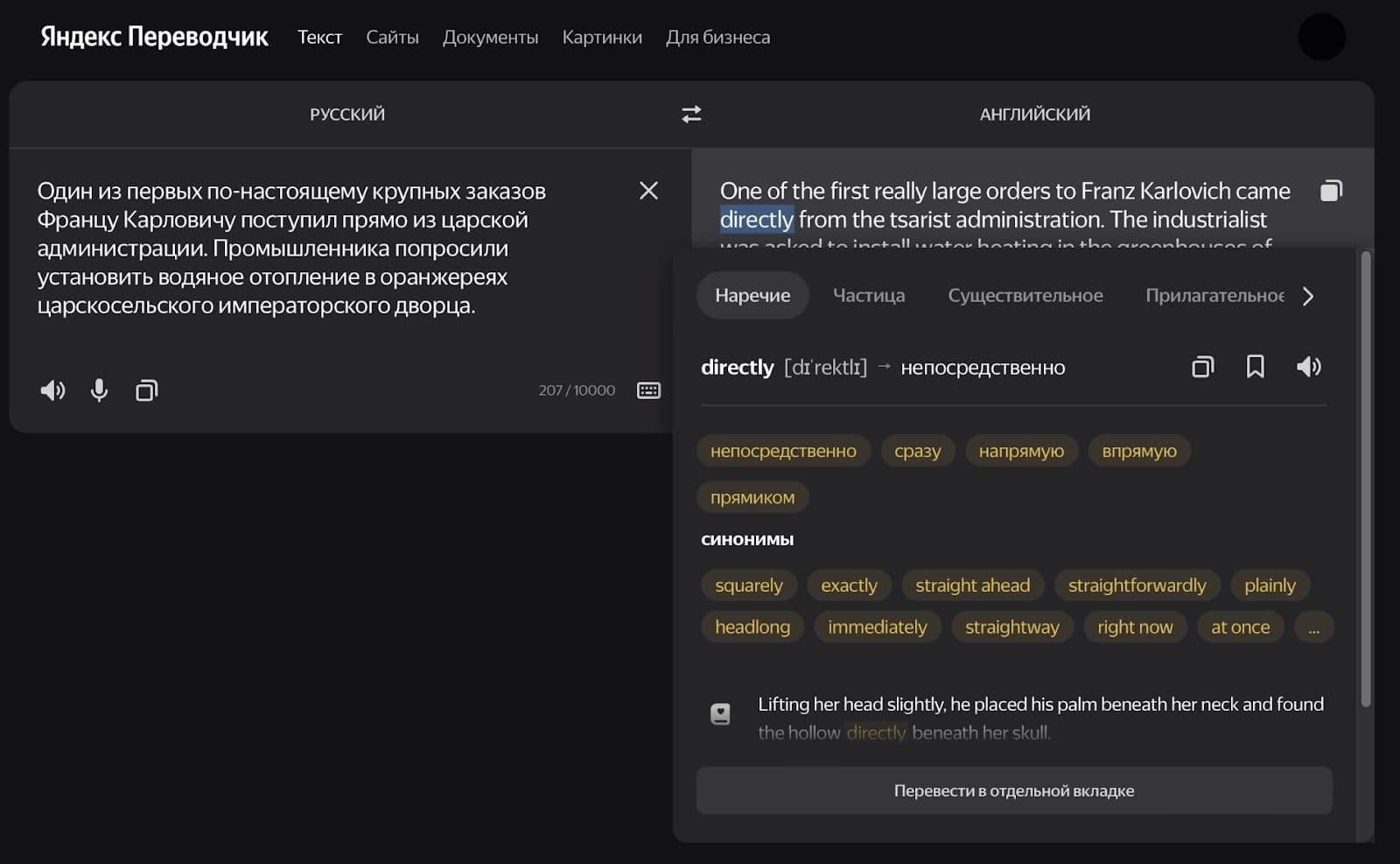 Два значительных различия между сервисами мы всё же смогли найти. Первое — у веб-версии «Яндекс Переводчика» гораздо более удобный словарь, который даёт определения и примеры использования любого слова в переводе.