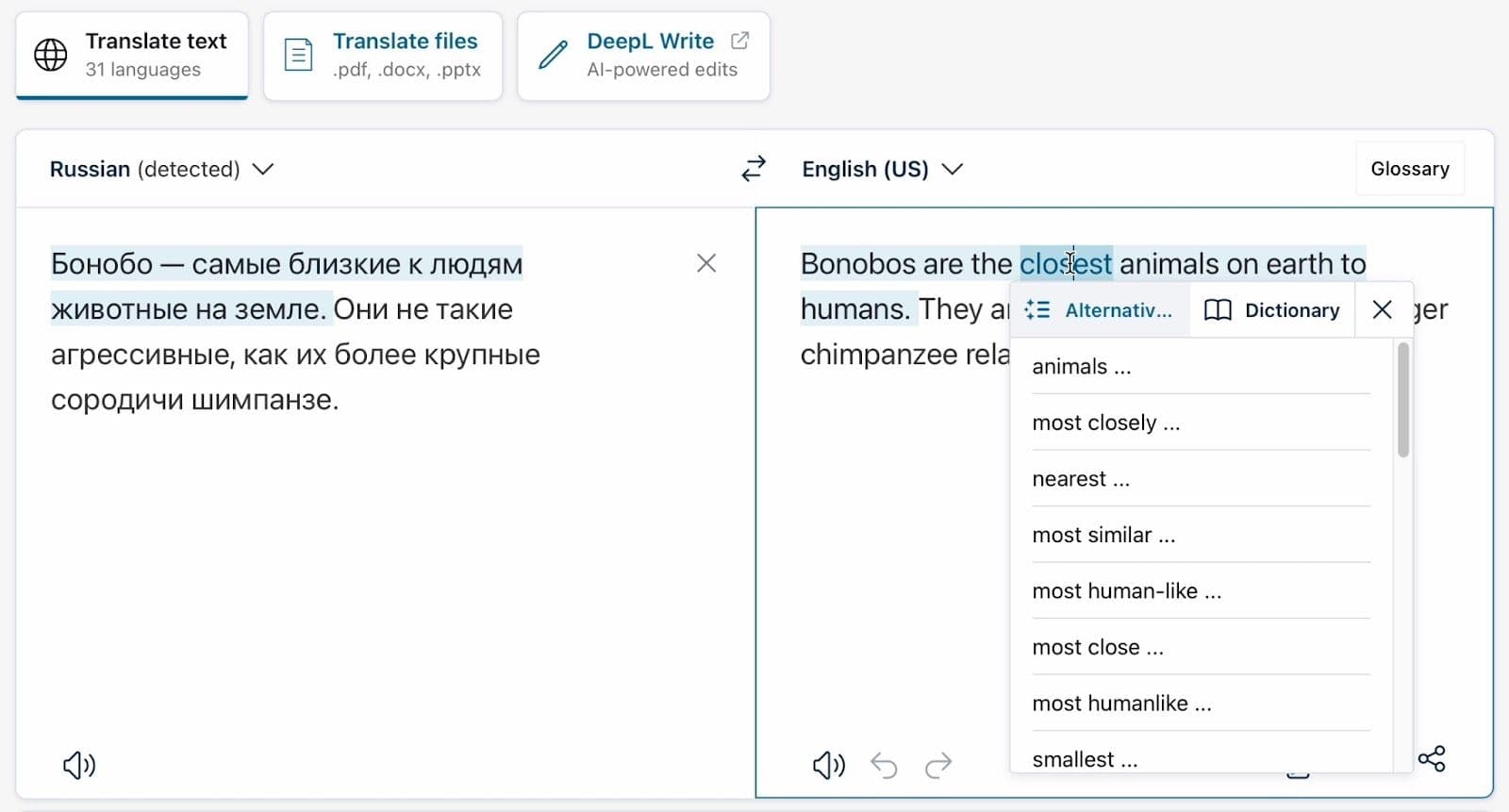 Главная особенность переводчика — возможность выбирать из нескольких вариантов перевода для каждого слова и предложения. Для этого нужно просто нажать на фрагмент текста, и DeepL раскроет выпадающее меню с альтернативными переводами. А самое впечатляющее — сервис сам подстроит весь дальнейший текст под новый вариант, чтобы не нарушать грамматику абзаца.
